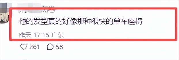 当天他的头发油腻地贴在脸颊和额头上,一缕一缕十分明显,有网友调侃像被雨水淋过,还有人说这造型酷似自行车车座。